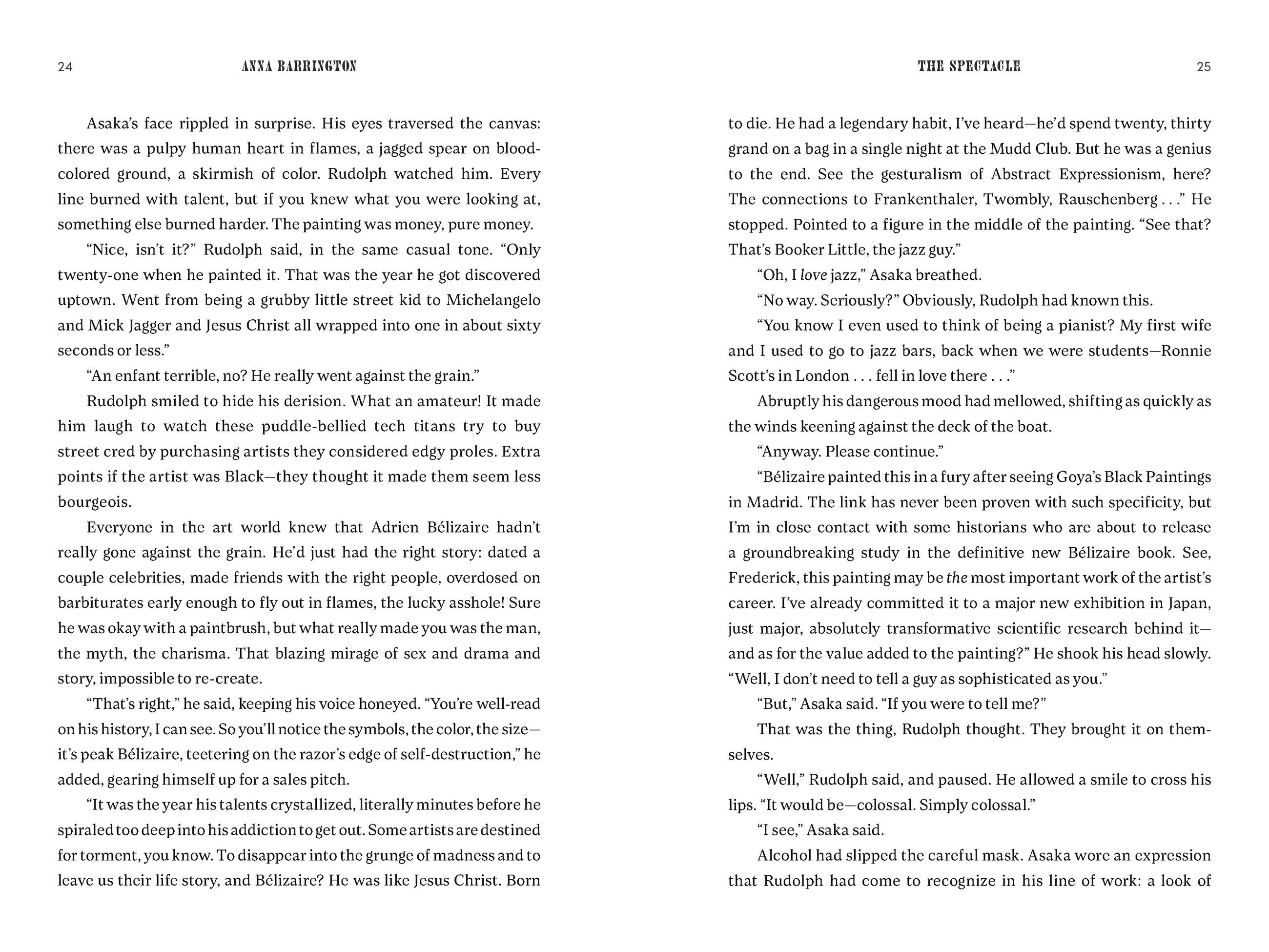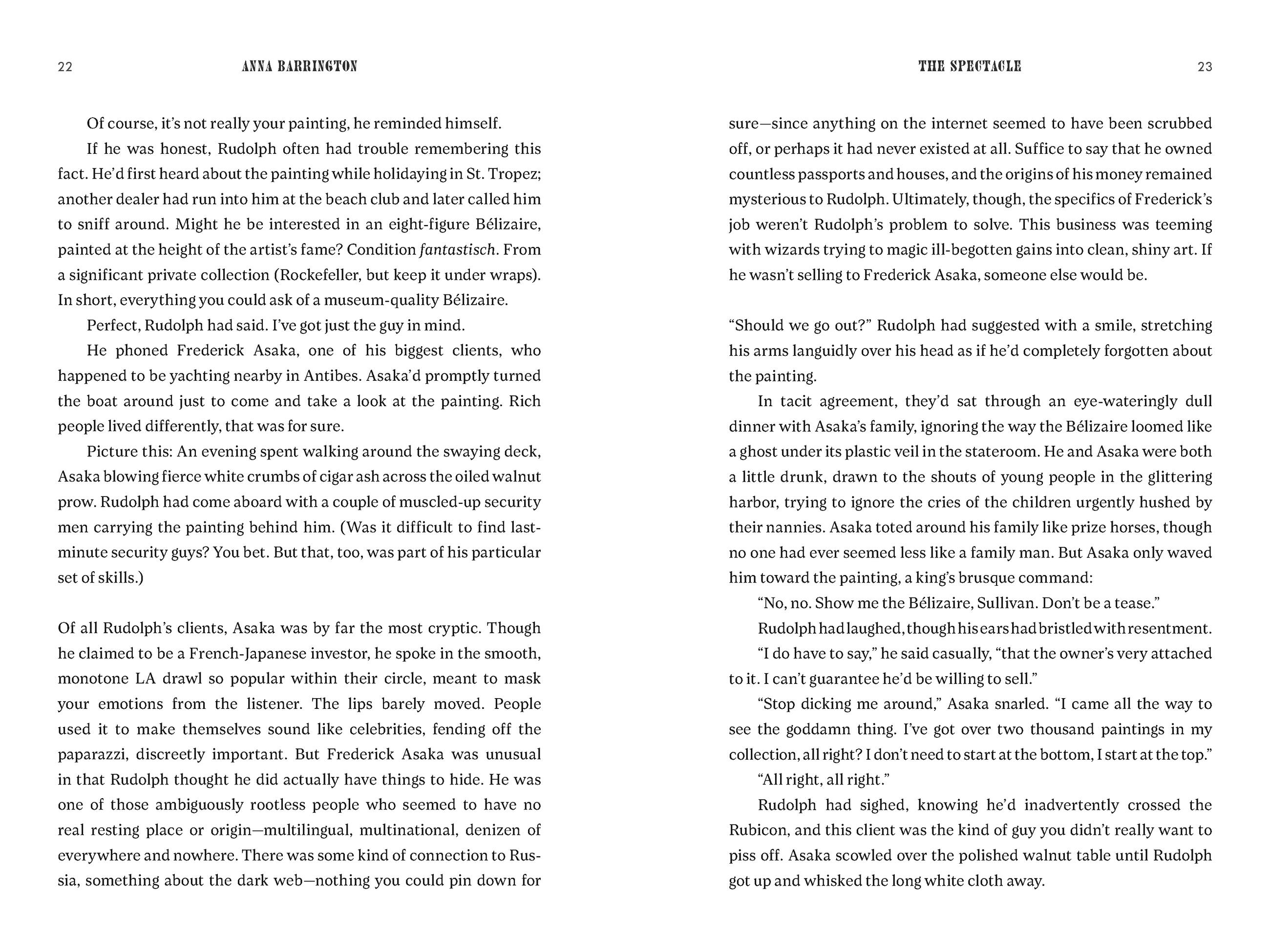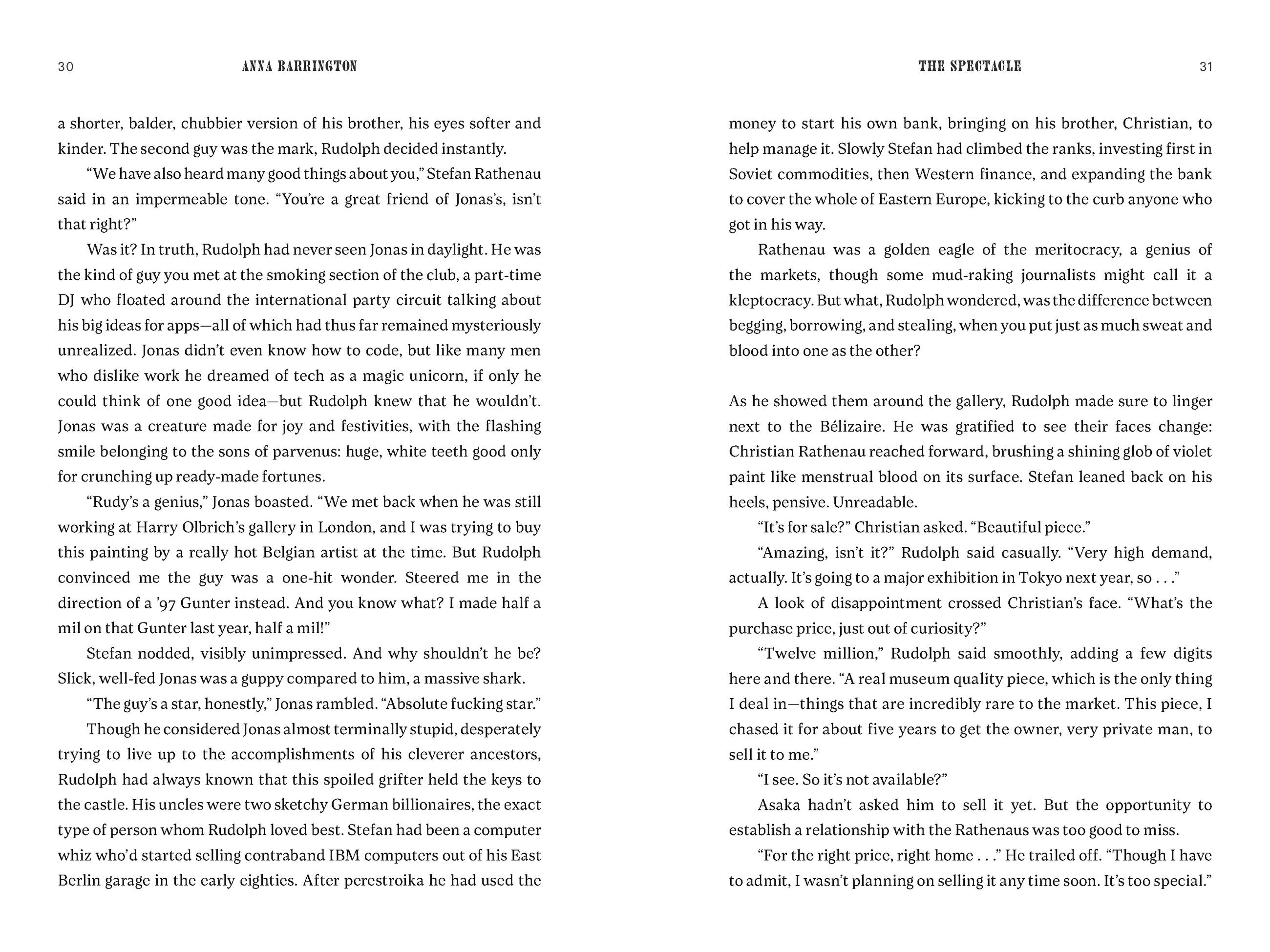 “A high-powered page-turner, The Spectacle does a deep dive into what lies beneath the shiny veneer of the art world. With unique insights and cutting satire, Anna Barrington reveals the ambition, greed, and fraud that fuels this multibillion-dollar business—not to mention a bracing love story. Highly recommended.”B. A. Shapiro, New York Times bestselling author of The Art Forger and The Lost Masterpiece