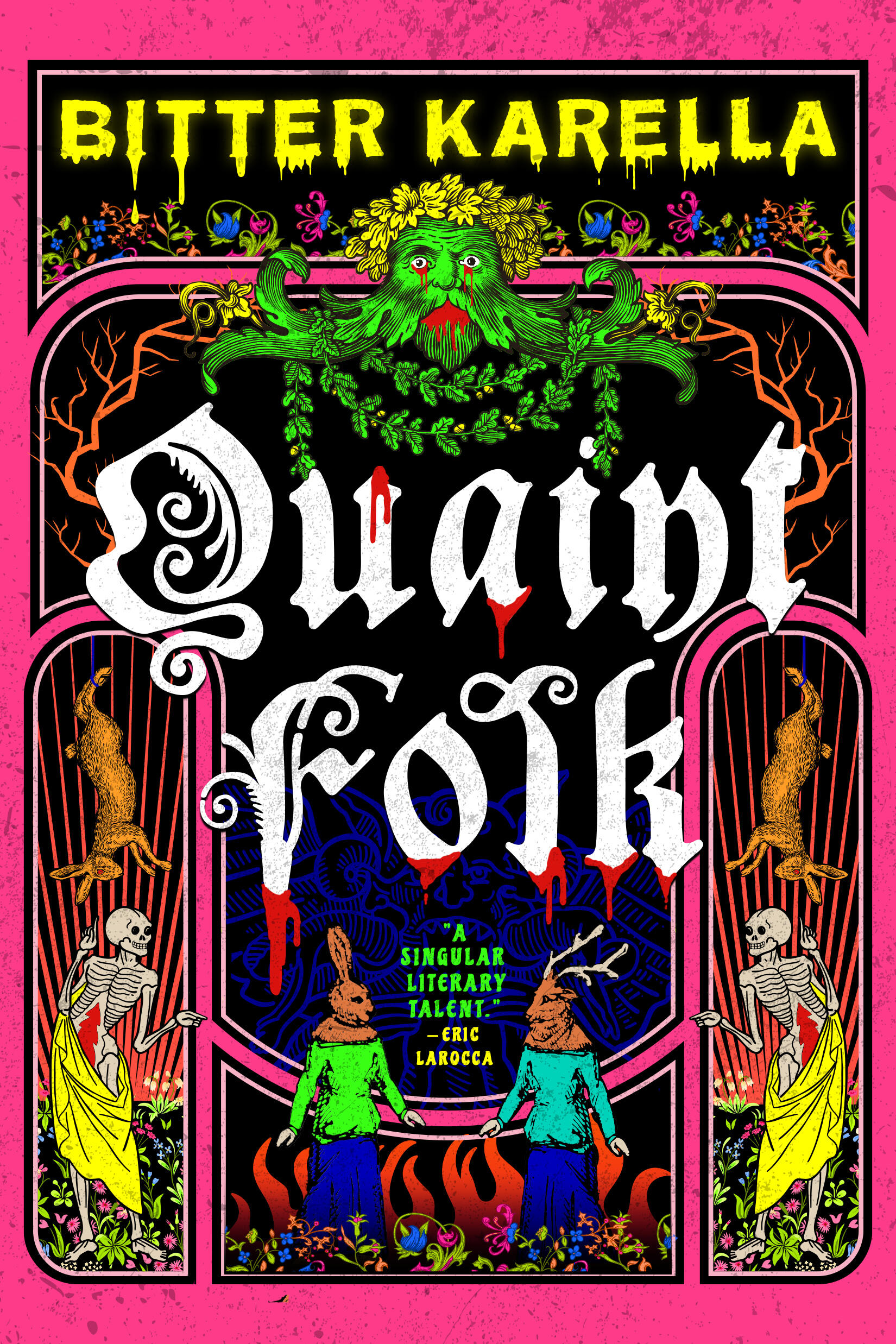The Wicker Man meets The Twisted Ones in Bitter Karella’s Quaint Folk—a queer folk horror novel that peels back the idyllic veneer of a seemingly perfect island town to reveal the rot beneath.