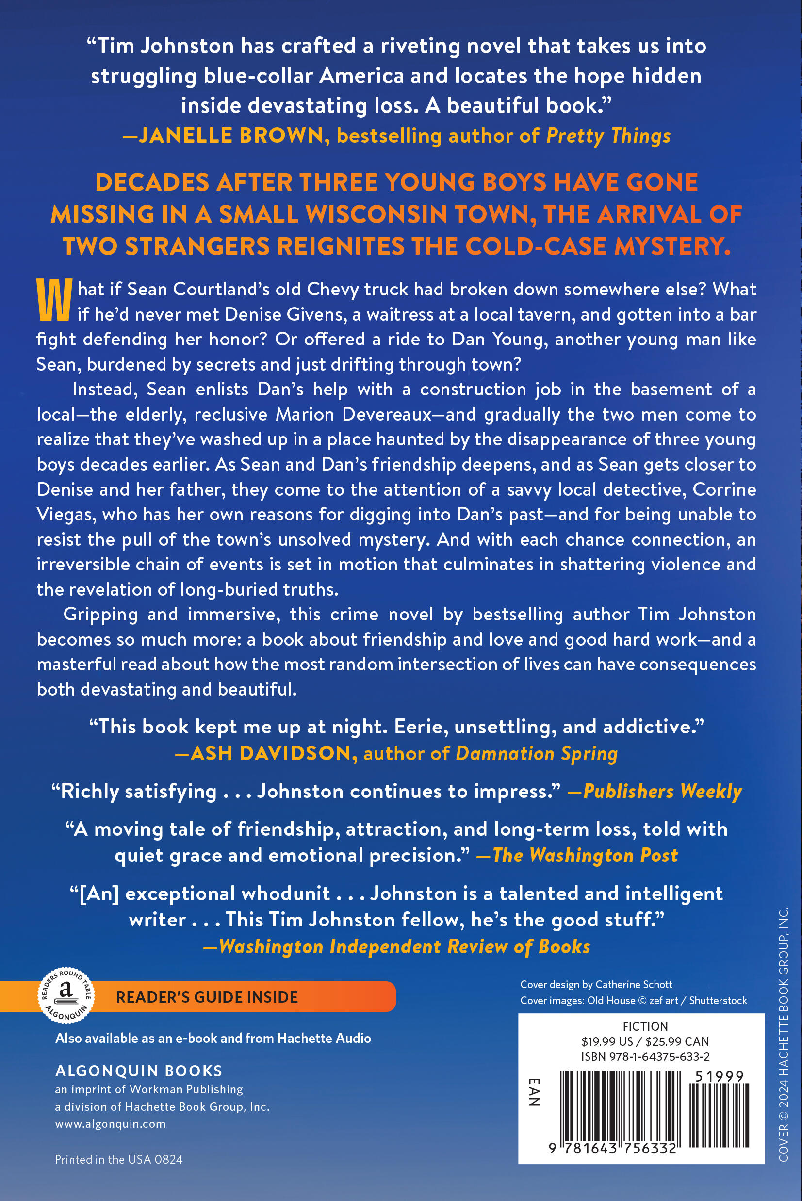 What if Sean Courtland’s old Chevy truck had broken down somewhere else? What if he’d never met Denise Givens, a waitress at a local tavern in the Wisconsin town where he lands? Or Dan Young, another young man like Sean drifting through, having fled Minnesota for reasons unknown? Instead, together Sean and Dan pick up carpentry and plumbing work for an old man named Marion Devereaux, and Sean gets drawn into the lives of Denise and her father—and of the townspeople, all haunted by the disappearance of three young boys decades ago, in the 1970s.