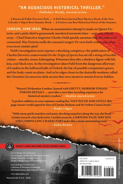 Field’s investigation soon exposes a shocking conspiracy: the publication of Charles Darwin’s controversial On the Origin of Species has set off a string of terrible crimes—murder, arson, kidnapping. Witnesses describe a shadowy figure with lifeless, coal-black eyes. As the investigation takes Field from the dangerous alleyways of London to the hallowed halls of Oxford, the list of possible conspirators grows, and the body count escalates. And as he edges closer to the dastardly madman called the Chorister, he uncovers dark secrets that were meant to remain forever hidden.
